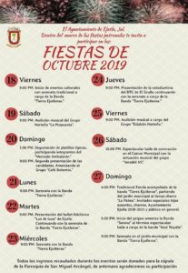 El H. Ayuntamiento de Ejutla te invita a participar dentro del marco de las fiestas patronales a los eventos culturales para todo el público en general como lo es su tradicional serenata en el jardín municipal a cargo de la banda tierra Ejutlense del municipio, así como también de los diferentes grupos musicales, Norteño la Propuesta, grupo Eslabón, la presentación de las candidatas a reinas 2019- 2020, ballet folclórico del municipio Luz de Luna, grupo Café Bohemio, la estudiantina del BTG del Grullo, Jalisco, y no podía faltar el baile de coronación en el casino municipal con el espectacular grupo Versátil V5 y como ya es costumbre terminar las fiestas con un jaripeo baile partiendo con la farola del jardín municipal al “Lienzo Charro la Palma” invitados de honor hijos ausentes, charros, H. Ayuntamiento y pueblo en general donde nos acompañaran la Banda Tierra Ejutlense, Banda Sereno y para el baile la espectacular Banda Azul Tequila.